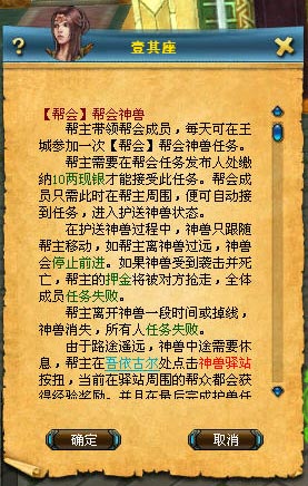 任務(wù)共享:幫會(huì)領(lǐng)取任務(wù)時(shí),幫主周圍的本幫成員君可以受到任務(wù)共享確認(rèn)窗口,幫眾可自行決定是否參與到護(hù)送任務(wù)中。