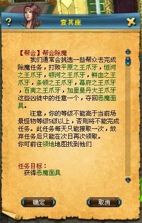 1.接取任務(wù):幫會(huì)中,等級(jí)不低于40級(jí)的幫會(huì)成員,每天可以自行接取此任務(wù),會(huì)根據(jù)等級(jí)段不同,給予不同的任務(wù)。