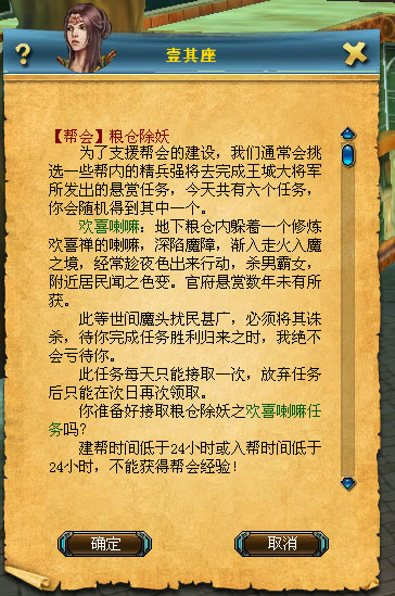 幫會(huì)等級(jí)大于等于三級(jí)才能夠領(lǐng)取對(duì)應(yīng)的任務(wù),不同等級(jí)的玩家領(lǐng)取的任務(wù)不同,70級(jí)~95級(jí)的玩家在糧倉完成除妖任務(wù),96級(jí)以上的玩家在仙人谷完成除妖任務(wù)。成功領(lǐng)取任務(wù)后,到指定的地方擊殺指定的目標(biāo)即可完成任務(wù)。每次擊殺的目標(biāo)隨機(jī),同幫會(huì)玩家一起擊殺指定目標(biāo)可共同完成任務(wù)。