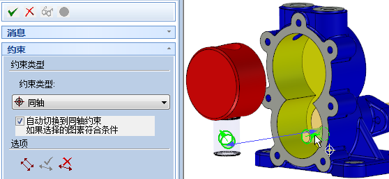 單擊“定位約束”按鈕,左鍵選擇柱塞軸,“約束類(lèi)型”自動(dòng)調(diào)整為“同軸”,然后用鼠標(biāo)左鍵選擇圓盤(pán)孔,如圖所示。