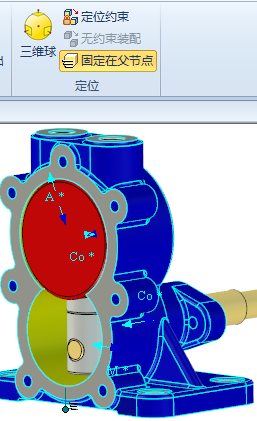 選擇泵體,單擊“固定在父節(jié)點(diǎn)”按鈕,這樣泵體零件位置為固定。