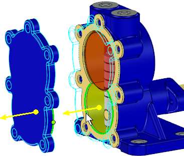 選擇側(cè)蓋,單擊“無(wú)約束裝配”按鈕,選擇側(cè)蓋上一特殊點(diǎn),比如如圖所示的圓中心,然后將鼠標(biāo)移動(dòng)到目標(biāo)零件墊片的對(duì)應(yīng)位置,如果藍(lán)色輪廓顯示的側(cè)蓋位置不合適,可以單擊Tab鍵反向,預(yù)顯位置合適時(shí)單擊左鍵確認(rèn)此次定位。
