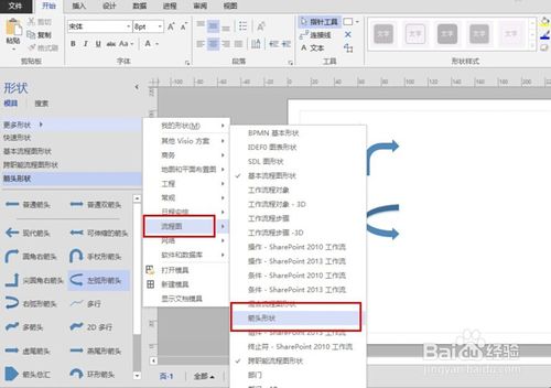 還有一種方法是在Visio中有模版提供箭頭圖, 具體位置見圖示, 直接選中需要的箭頭拖動到繪圖區(qū)域即可.