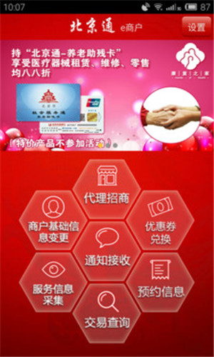 北京通e商戶(hù)APP是專(zhuān)為北京市社區(qū)服務(wù)協(xié)會(huì)發(fā)展簽約的服務(wù)商打造的提高商戶(hù)養(yǎng)老服務(wù)質(zhì)量,提升商戶(hù)品牌和交易額的信息化應(yīng)用,主要為商戶(hù)提供七大增值服務(wù)。包含了商戶(hù)基礎(chǔ)信息變更、服務(wù)信息采集,交易查詢(xún),代理招商、通知接收,優(yōu)惠券兌換以及預(yù)約信息。讓商戶(hù)們能夠更輕松的為老人們提供優(yōu)質(zhì)的服務(wù),從而提升自己的品牌和提高自身的交易額,既為養(yǎng)老助殘事業(yè)貢獻(xiàn)一份力又使自身得到快速發(fā)展,實(shí)現(xiàn)雙贏(yíng)。
