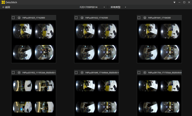 F4 Plus通過官方標(biāo)配的USB連接電腦,選擇DetuStitch相機(jī)模式后,會出現(xiàn)相機(jī)搜索中,搜索完成后出現(xiàn)相機(jī)里面所有的內(nèi)容,可以自主選擇類型:圖片/視頻