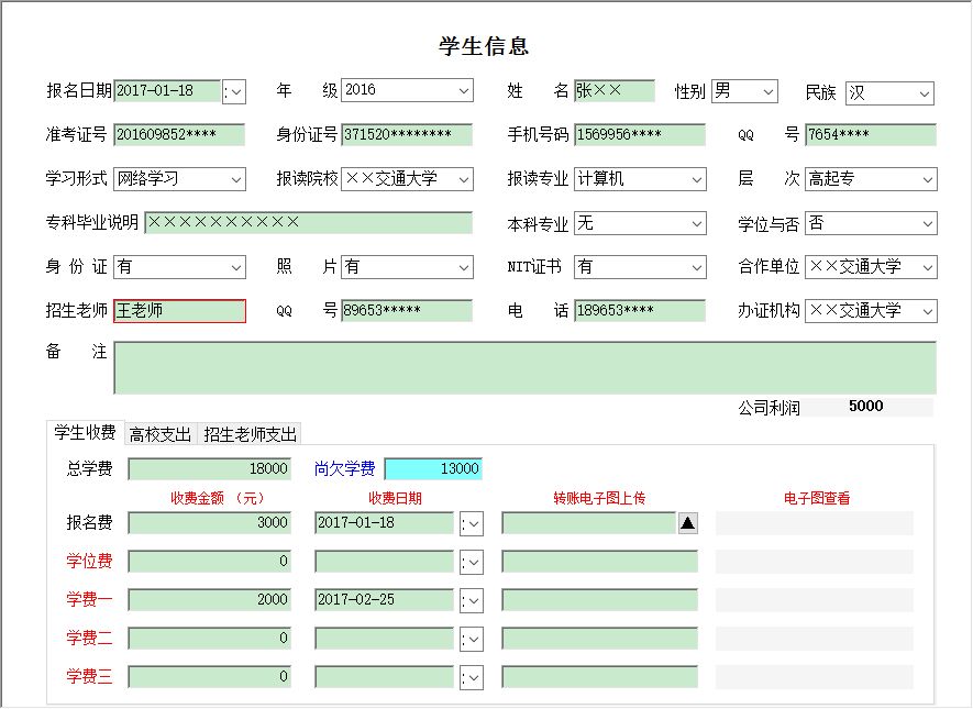 《學(xué)歷教育報名財務(wù)管理系統(tǒng)》是一款針對學(xué)歷教育招生部門開發(fā)的一款財務(wù)軟件。該軟件集學(xué)生報名收費、高校收費、招生老師招生費用統(tǒng)計與一體。軟件界面設(shè)計簡潔、美觀其人性化的管理可以使用戶輕易上手,大大節(jié)省工作時間,提高工作效率??茖W(xué)的管理方法會給您帶來無限的效益,學(xué)歷教育報名財務(wù)管理系統(tǒng)將是您明智的選擇。 《學(xué)歷教育報名財務(wù)管理系統(tǒng)》包括如下功能:學(xué)生信息、學(xué)生信息導(dǎo)出、學(xué)生收費查詢、學(xué)生欠款明細(xì)、招生查詢、高校支出明細(xì)、利潤統(tǒng)計