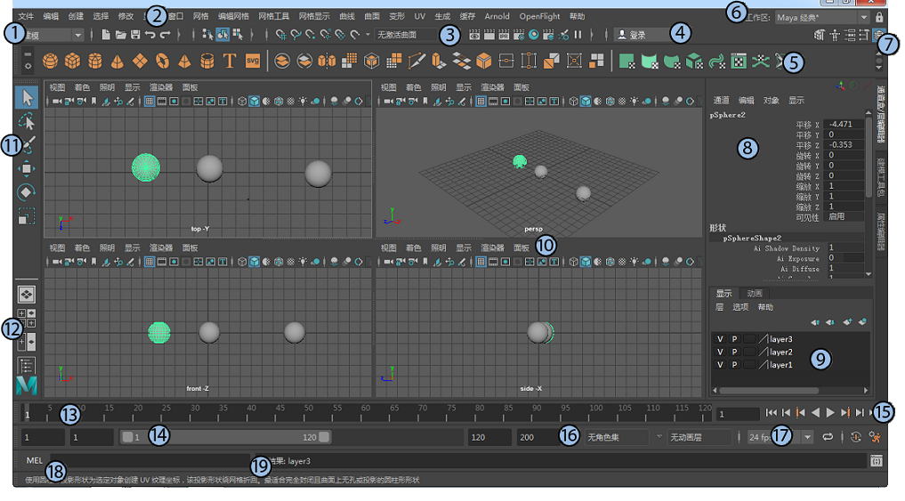 本部分簡要概述了 Maya 主界面。以下編號的標(biāo)題是指圖中編號的界面元素。如果找不到要查找的菜單,可能是未打開正確的菜單集。請參見菜單和菜單集。也可以選擇“幫助 > 查找菜單”(Help > Find Menu),然后輸入要查找的菜單或命令的名稱。