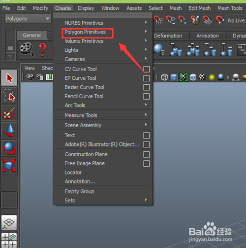 在該界面內(nèi)找到create菜單,點(diǎn)擊create菜單在其子級菜單里找到polygons primitives選項(xiàng),如圖所示: