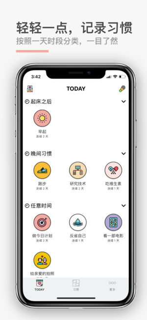 2.今天要堅(jiān)持的習(xí)慣會(huì)單獨(dú)呈現(xiàn)在 TODAY 頁面中,輕輕一點(diǎn)圖片即表示完成該習(xí)慣的打卡;