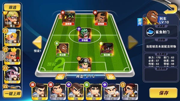 中后場(chǎng)三人組是整個(gè)游戲中力量最強(qiáng)的組合。桑巴是標(biāo)準(zhǔn)的站樁中鋒,主要作用是在前場(chǎng)爭(zhēng)奪球權(quán)和中路的搶點(diǎn)。大耳朵其實(shí)適用于任何陣容,如果沒(méi)有的話也可以用一個(gè)擅長(zhǎng)帶球和傳中的前鋒跟桑巴配合