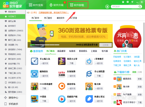 2、然后我們就是打開我們360安全中心的軟件管理,然后我們可以看到我們軟件中心,這里我們所有的軟件都會(huì)出現(xiàn)在這里,然后我們?cè)邳c(diǎn)擊上面的軟件卸載選擇項(xiàng),這里就會(huì)出現(xiàn)我們自己的軟件。