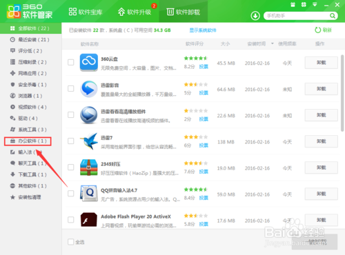 3、然后我們可以在軟件卸載界面看不到我們的office2016這個(gè)軟件的,這里我們就是需要點(diǎn)擊最左邊的辦公軟件。