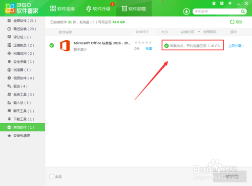 8、最后我們就可以成功的刪除掉這個(gè)軟件了,一般來說,辦公軟件基本上都比較難刪除的,我們使用這種辦法刪除比較容易的,也不需要去網(wǎng)上下載上面刪除軟件,所以大家需要?jiǎng)h除的可以使用這種辦法喲。