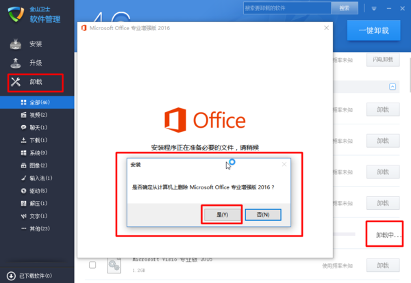 office2013怎么卸載?1、采用第三方卸載工具(比如金山衛(wèi)士→軟件管理),選擇需要卸載的office2013(圖示為卸載office2016,參考用);