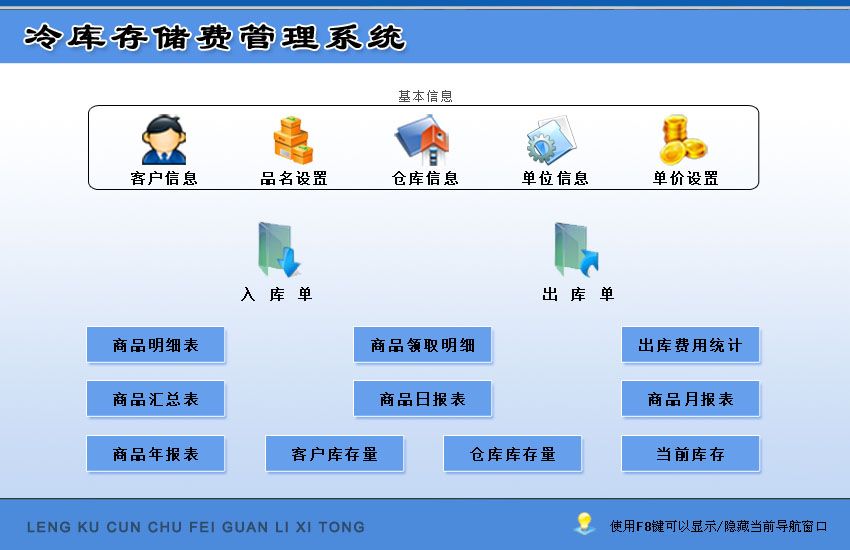 《冷庫(kù)存儲(chǔ)費(fèi)管理系統(tǒng)》是根據(jù)冷庫(kù)存儲(chǔ)的管理進(jìn)行開發(fā)的一款軟件,該軟件操作簡(jiǎn)單,界面簡(jiǎn)潔。區(qū)別于其他同類軟件的主要特點(diǎn)是:入庫(kù)時(shí)定義存儲(chǔ)單價(jià),出庫(kù)時(shí)結(jié)算存儲(chǔ)費(fèi)。軟件主要功能包括:商品管理:入庫(kù)單、出庫(kù)單、商品明細(xì)表、商品領(lǐng)取明細(xì)和出庫(kù)費(fèi)用統(tǒng)計(jì)。數(shù)據(jù)統(tǒng)計(jì):商品匯總表、商品日?qǐng)?bào)表、商品月報(bào)表、商品年報(bào)表、客戶庫(kù)存量、倉(cāng)庫(kù)庫(kù)存量和當(dāng)前庫(kù)存?;拘畔ⅲ嚎蛻粜畔?、品名設(shè)置、倉(cāng)庫(kù)信息、單位信息和單價(jià)設(shè)置。本軟件可以查看實(shí)時(shí)的庫(kù)存情況及庫(kù)存物品所產(chǎn)生的費(fèi)用。