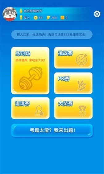 泡椒答題為游戲玩家提供了多種答題玩法:1)、練習(xí)場:供用戶進(jìn)行答題練習(xí)、修煉等級,獲取爆庫(答完題庫)現(xiàn)金大獎;