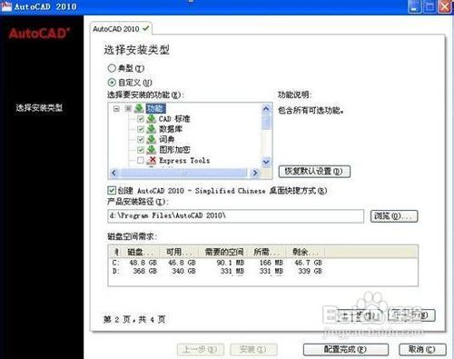 5、在“選擇安裝類型”中選擇“自定義”單選項(xiàng),在下面的列表中勾選所需要安裝的程序,然后按需設(shè)置安裝,點(diǎn)擊“下一步”繼續(xù)設(shè)置或“配置完成”按鈕繼續(xù)“安裝”: