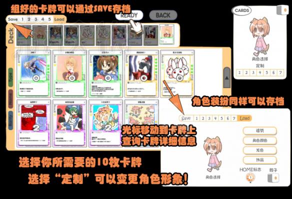 選好的卡組可以通過點(diǎn)擊“SAVE”后再點(diǎn)擊卡槽1-5進(jìn)行保存,以后就不用每次都配卡了,從LOAD中讀取即可。