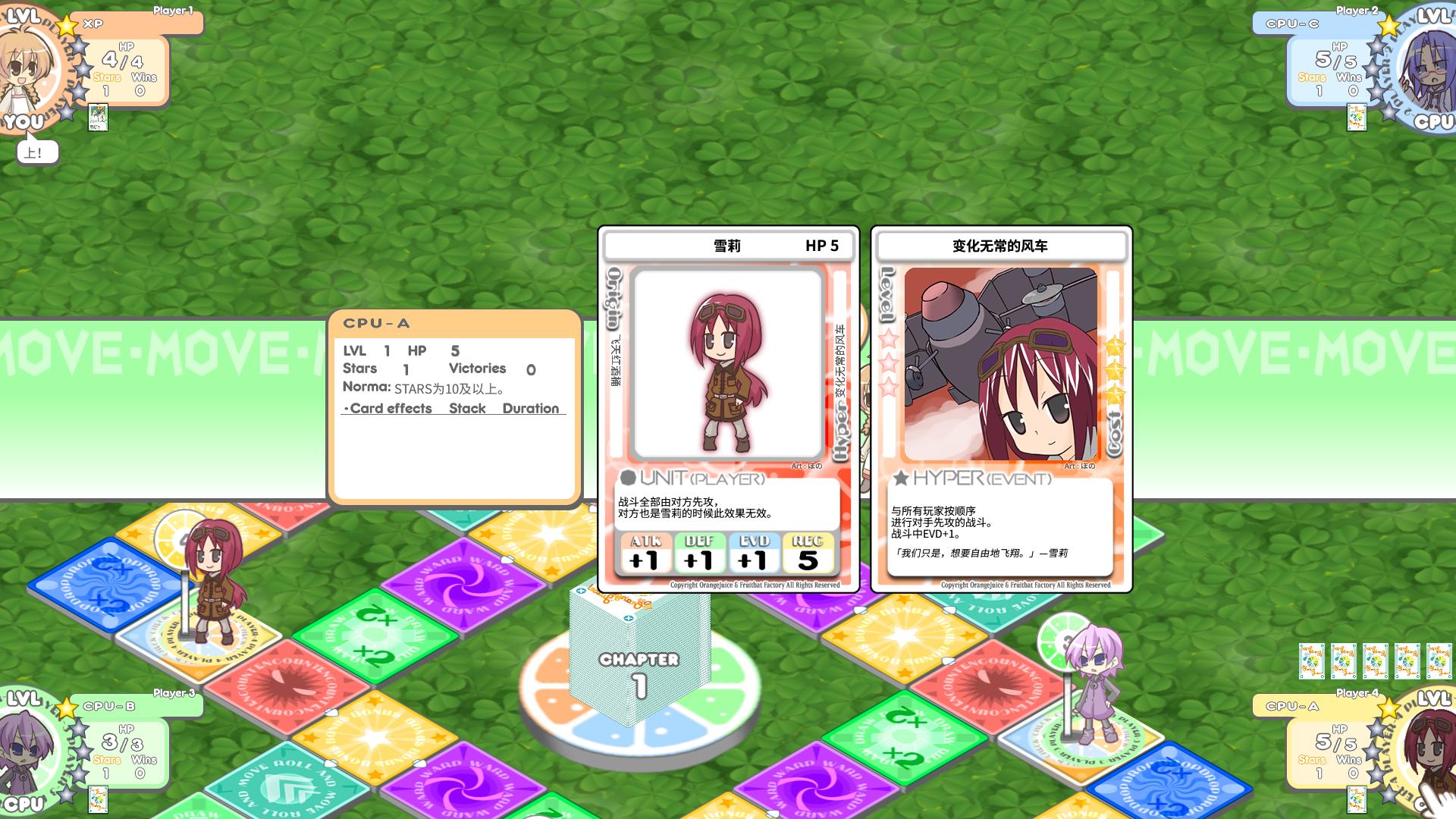 《100%鮮橙汁》是Fruitbat Factory制作發(fā)行的一款日系風(fēng)格休閑益智小游戲。游戲采用日系畫風(fēng),整體看來很可愛。游戲玩法同大富翁類似,需要通過擲骰子來移動(dòng)和戰(zhàn)斗,操作起來也相當(dāng)簡便,并不需要過多人工操作。