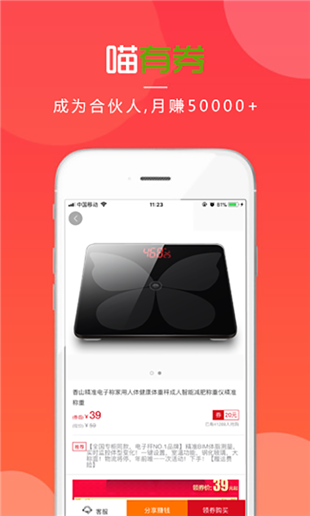 喵有券,優(yōu)惠券導購社交電商新秀,是國內目前主流的優(yōu)惠券導購APP。用戶通過先領券再下單,可享受更低的價格,同時,喵有券合伙人還可以分享商品,賺取傭金。