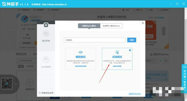 點擊 “新建應用” > 選擇 “爬蟲”,點擊 “下一步” > 選擇 “自己開發(fā)” > 選擇 “點選模式”。輸入爬蟲名稱,點擊”創(chuàng)建”