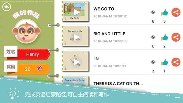 3、英語(yǔ)學(xué)糖app遵循語(yǔ)言習(xí)得理論和兒童學(xué)習(xí)語(yǔ)言的特點(diǎn),分三個(gè)階段完成英語(yǔ)啟蒙,幫助兒童成為合格的英文自主閱讀者和英文自主寫作這。