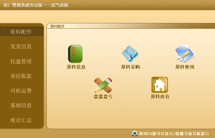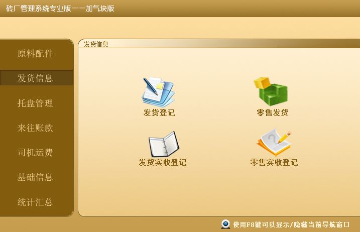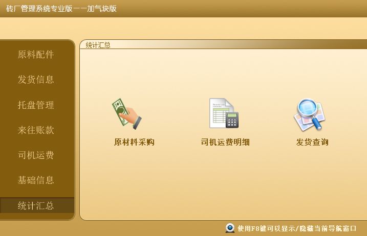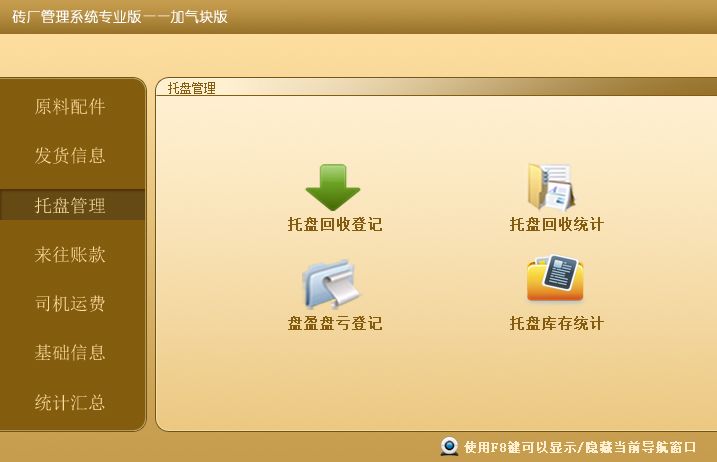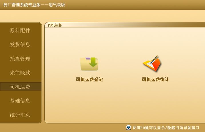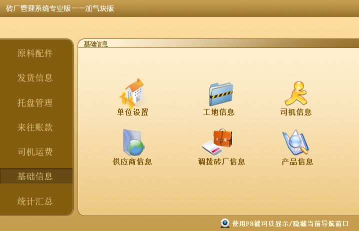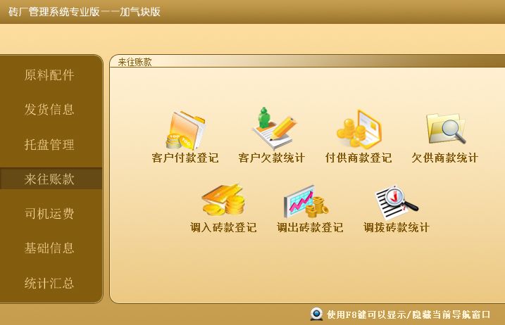 軟件包含: 1、原料配件:原料信息、原料采購、原料使用、盤盈盤虧、原料庫存 2、發(fā)貨信息:發(fā)貨登記、零售發(fā)貨、發(fā)貨實收登記、零售實收登記 3、托盤管理:托盤回收、托盤回收統(tǒng)計、盤盈盤虧登記、托盤庫存統(tǒng)計 4、來往賬款:客戶付款登記、客戶欠款統(tǒng)計、付供商登記、欠供商款統(tǒng)計、調(diào)入磚款登記、調(diào)出磚款登記、調(diào)撥磚款統(tǒng)計 5、司機(jī)運費:司機(jī)運費登記、司機(jī)運費統(tǒng)計 6、基礎(chǔ)信息:單位設(shè)置、工地信息、司機(jī)信息、供應(yīng)商信息、調(diào)撥磚廠信息、產(chǎn)品信息 7、統(tǒng)計匯總:原材料采購、司機(jī)運費明細(xì)、發(fā)貨明細(xì) 軟件特點: 1.支持?jǐn)?shù)據(jù)與execel的導(dǎo)出與導(dǎo)入; 2.查詢統(tǒng)計功能強(qiáng)大; 3.信息管理方便簡單。