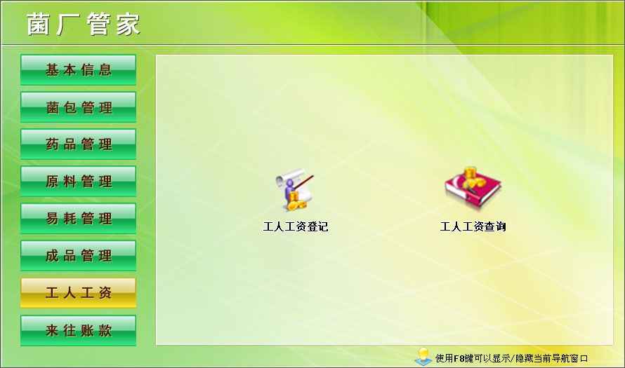 《菌廠管家》是一款應(yīng)用于食用菌行業(yè)的管理軟件,可以對食用菌生產(chǎn)、庫存進(jìn)行規(guī)范化管理。 系統(tǒng)包含: 1、基本信息:客戶信息、單位設(shè)置、庫房號 2、菌包管理:菌包信息、菌包入庫、菌包轉(zhuǎn)房、菌包淘汰、淘汰查詢、入庫查詢、轉(zhuǎn)房查詢、菌包庫存 3、藥品管理:藥品信息、藥品采購、藥品使用、藥品庫存、采購查詢、使用查詢 4、原料管理:原料信息、原料入庫、原料使用、原料庫存、入庫查詢、使用查詢 5、易耗管理:物品信息、物品入庫、物品使用、物品庫存、入庫查詢、使用查詢 6、成品管理:成品信息、成品入庫、銷售出庫、入庫查詢、銷售查詢、成品庫存 7、工人工資:工資工資登記、工人工資查詢 8、來往賬款:客戶付款、客戶欠款