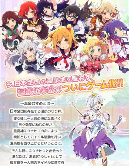 溫泉擬人作品《溫泉少女》登場!因為某種事,受到神明委托的你成為了溫泉勇士,你需要將溫泉少女培育成出色的偶像,在日本各地進行巡回演出,讓場面如溫泉一般沸騰!