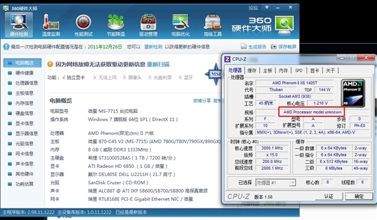 魯大師(360硬件大師)的另一大賣(mài)點(diǎn)是:專(zhuān)業(yè)而易用的硬件檢測(cè),輕松辨別硬件真?zhèn)?,那么我們用另一臺(tái)電腦進(jìn)行檢測(cè),這是剛剛幫朋友裝的一臺(tái)主機(jī),用的是Athlon II X4 640T開(kāi)成六核,360硬件大師好樣的,直接把CPU識(shí)別成了羿龍II六核,這讓編輯和朋友看著都很開(kāi)心。