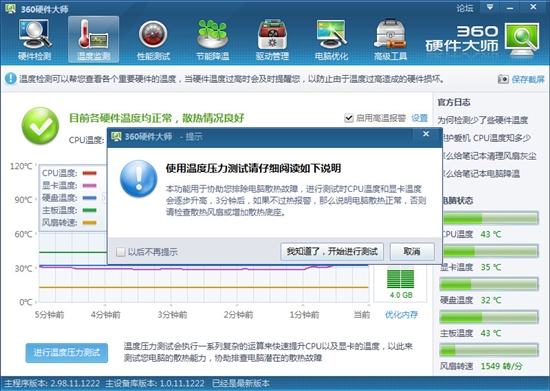 除了溫度監(jiān)控外,360硬件大師還有個(gè)溫度壓力測(cè)試的功能,也就是讓電腦滿(mǎn)負(fù)載拷機(jī),測(cè)試電腦的穩(wěn)定性和散熱情況,我們來(lái)試試看好不好用?