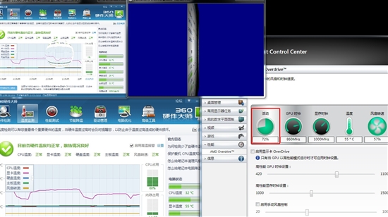 魯大師(360硬件大師)的拷機(jī)工具只是在兩個(gè)窗口中對(duì)其進(jìn)行旋轉(zhuǎn)和液化,打開(kāi)A卡驅(qū)動(dòng)控制面板后發(fā)現(xiàn)GPU利用率只達(dá)到了72%,這個(gè)幼稚的測(cè)試項(xiàng)目根本不能讓GPU滿(mǎn)負(fù)載運(yùn)行,此時(shí)顯卡的溫度也只有57度。