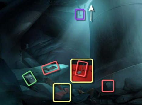 1、點(diǎn)擊開(kāi)始,片頭略過(guò),看看信息(綠框),看看紅布條(黃框) ;收集的東西有仨,紅布條上的音符、石桌上的紙、一塊石頭,都是紅框的。解決的謎題一個(gè),把石桌上的紙,其實(shí)就是個(gè)畫(huà)繩子接到向上的出口上(紫色),謎題破解,繩子延長(zhǎng)了,咱可以爬上去了。剩一個(gè)沒(méi)道具以后再說(shuō)。