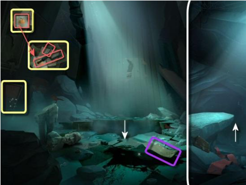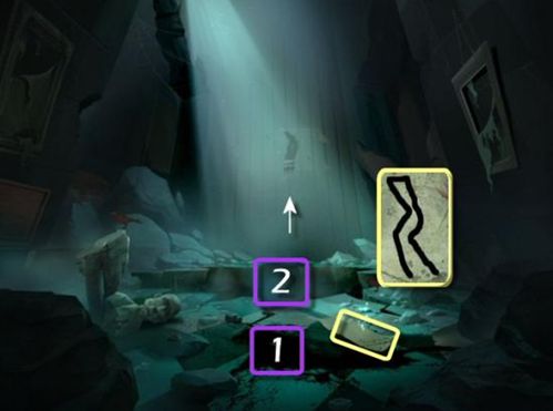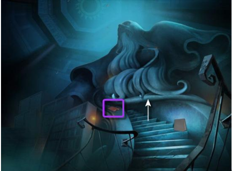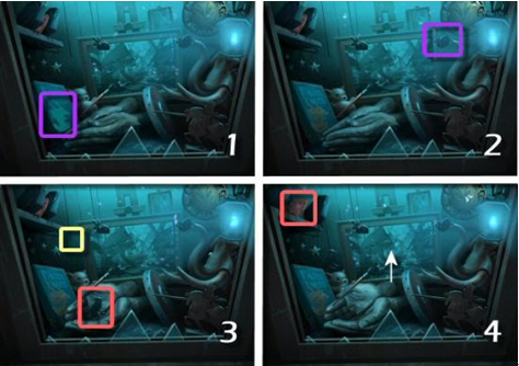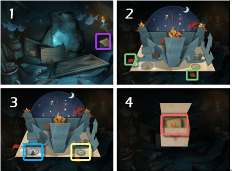 4、首個(gè)場(chǎng)景的最后一個(gè)謎題解決掉,把得到的反光盤(pán)放桌兒上(紫框),前方的路亮了,地下留下一張紙火焰(紅框),撿起來(lái)揣兜兒。