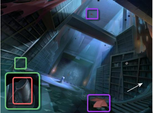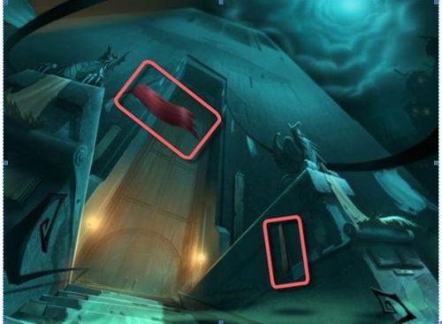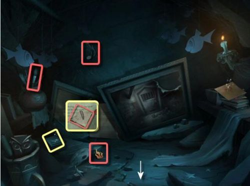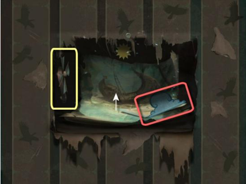 8、橋?qū)γ媸莻€(gè)破環(huán)的墻壁,左一下,右一下撕掉破布,小方格子里兩樣?xùn)|西,一個(gè)木炭,一沓閃光的紙 ,查看那沓紙里面有三樣物品,銀音符、燈夫圖片、鏟子;四樣兒東西拿好,咱就可以進(jìn)入首張畫(huà)了。