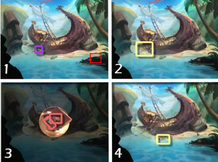 11、畫(huà)面中風(fēng)輕云淡,是個(gè)不錯(cuò)的天,如果說(shuō)十字標(biāo)記通常代表寶藏,那咱們可以動(dòng)手了,1中紫框位置為十字光影,掏出居家必備的小鏟子挖開(kāi)寶藏?fù)炱鸫笈诤桶l(fā)光的時(shí)候,1中紅框的位置拿起椰子。砸碎4中的漂流瓶,查看內(nèi)容,進(jìn)入了一張海盜卡片。