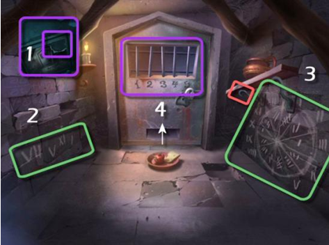 對(duì)應(yīng)右邊的輪盤(pán)得到2、4、4、5。恩跟牢房門上的鐵條對(duì)應(yīng)上了。卸掉右邊墻上搭架子的鐵鉤,趁手兒的家伙有了。用鐵鉤敲對(duì)應(yīng)鐵條。門開(kāi)了,進(jìn)去一看,一片蕭條。