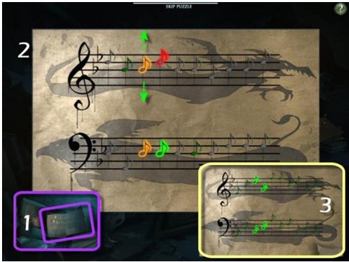 17、推出了畫(huà)框,它也倒了下來(lái),再無(wú)進(jìn)入的可能了,看看左邊樂(lè)譜開(kāi)始閃光。銀音符該派上用場(chǎng)了。把音符都放上去,上下調(diào)節(jié)。橙色代表差一行,紅色代表差兩行以上,綠的代表剛剛好。沒(méi)啥難度,挪動(dòng)挪動(dòng)結(jié)果如3。之后天塌地陷。