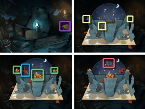 18、跳過(guò)動(dòng)畫(huà),轉(zhuǎn)臉看看右邊那個(gè)立體書(shū),它的閃光讓我礙眼很久了,打開(kāi)立體書(shū)把有紅簽的都挪一挪,上面出現(xiàn)了三座橋,把撿到的三張紙火焰分別放上去;在藍(lán)框的位置有個(gè)紅色的卡槽,把紙鳳凰卡進(jìn)去;拖著紙鳳凰劃過(guò)天幕得到女王石楔。推出礙眼的立體書(shū),它仍然在閃光但是我對(duì)它毫無(wú)辦法。怒氣沖沖的丟下它前行。