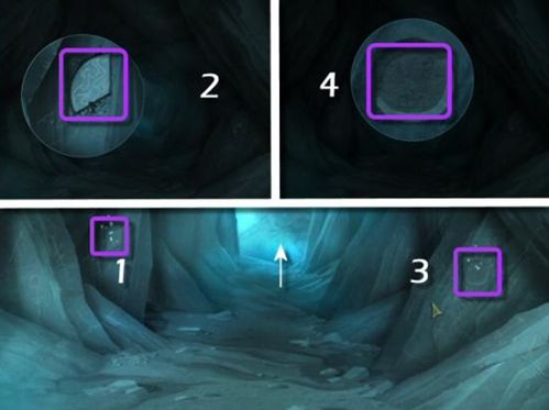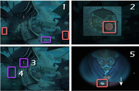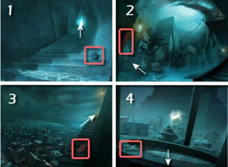 22、芝麻開(kāi)門了我們繼續(xù)前行,腳邊的石頭符號(hào)(1)撿起來(lái),繼續(xù)溜達(dá)。跳過(guò)動(dòng)畫(huà),拿下來(lái)左邊的一塊紅布(2),左拐、左拐爬樓梯,撿起來(lái)另一塊紅布(3),讓我想起來(lái)老崔。繼續(xù)前行拿到海報(bào)碎片(4)