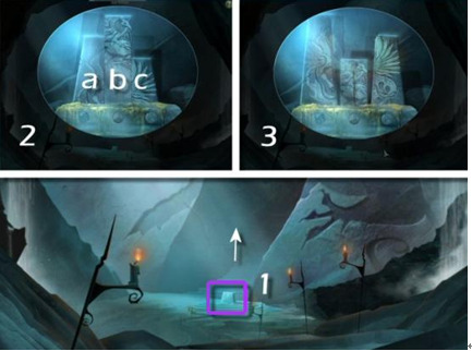 38、重新來(lái)到右側(cè),這次直接蹬到人像的眼睛前面。又是一個(gè)圓形的謎題。把得到的符文安在上面。