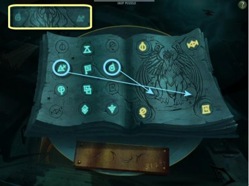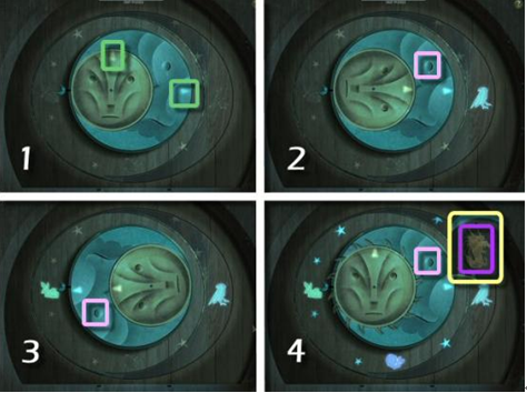 34、真神奇,風(fēng)箏的影子開(kāi)啟了兩尊門神。看看右邊的書(shū),4個(gè)位子對(duì)應(yīng)的符號(hào)時(shí)隱時(shí)現(xiàn),把書(shū)頁(yè)左邊的對(duì)應(yīng)移到右邊。并記錄數(shù)字對(duì)應(yīng)的符號(hào)下來(lái)都是什么。這時(shí)候查看左邊的書(shū),左邊的書(shū)四個(gè)角填上右邊記錄下來(lái)對(duì)應(yīng)的符號(hào),并記下中間位置時(shí)隱時(shí)現(xiàn)的兩個(gè)符號(hào),填到右邊書(shū)的中間位置。貌似每次通關(guān)的符號(hào)也不同。