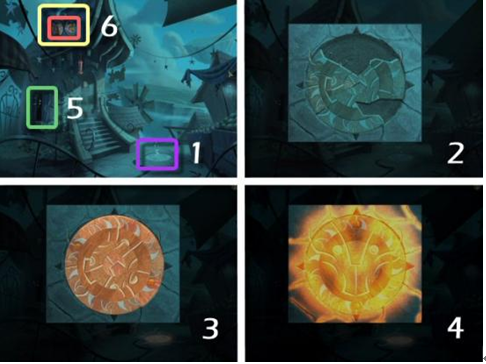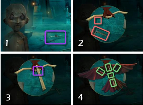 24、不由我控制的進(jìn)入了海報(bào),兩邊撿紅布,地上撿起來(lái)石頭符文。放出小蜂鳥(niǎo)到喂鳥(niǎo)器(3),小鳥(niǎo)飛到4附近點(diǎn)下窗子??吹交ń?,還有他桌子上的小圓盤(pán)(5)。