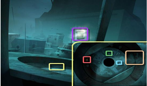 9、先看看右下角的紙片,缺一個(gè)角,咱掏出來(lái)補(bǔ)上,得到根皮帶,把紙上寫(xiě)的東西翻譯下記下來(lái),順時(shí)針5,逆時(shí)針西南,順時(shí)針3、逆時(shí)針6。船身上的閃光查看下,貌似一個(gè)謎題,按照破解的密碼轉(zhuǎn)一下,順時(shí)針轉(zhuǎn)到5(藍(lán)圈),逆時(shí)針轉(zhuǎn)到西南(10,綠圈),順時(shí)針轉(zhuǎn)到3(粉圈),逆時(shí)針轉(zhuǎn)到6(黃圈)。四個(gè)鎖都打開(kāi),跳出一地零碎,共四樣,圣杯、錨、扇葉、城堡石楔。