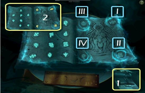 37、四本書(shū)都到手了全身而退,來(lái)到圖書(shū)館深處,填入四本書(shū),得到3個(gè)亮起的提示符號(hào),記下來(lái)。點(diǎn)擊書(shū)臺(tái),上面拿到最后一塊石頭符文。退回