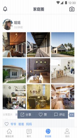 【家庭圈】基于家庭成員的社交分享空間,支持上傳分享圖片和視頻,支持點贊和評論。