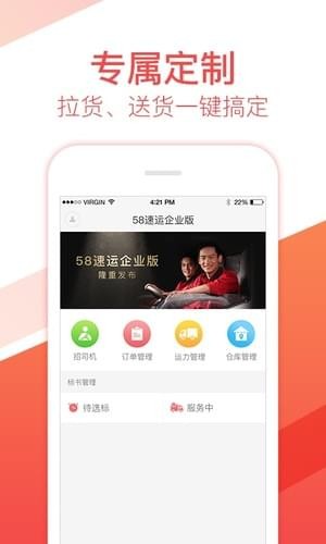 58速運(yùn)企業(yè)版-海量司機(jī),車(chē)費(fèi)月結(jié)。價(jià)格低、叫車(chē)快!拉貨、搬家就找58速運(yùn),中國(guó)人壽承保,保證您的貨物快速、下載APP即可召喚您身邊的專(zhuān)業(yè)司機(jī)。所有司機(jī)均經(jīng)過(guò)嚴(yán)格考核,專(zhuān)業(yè)培訓(xùn),持證上崗,每筆訂單均有客服全程跟蹤服務(wù)。