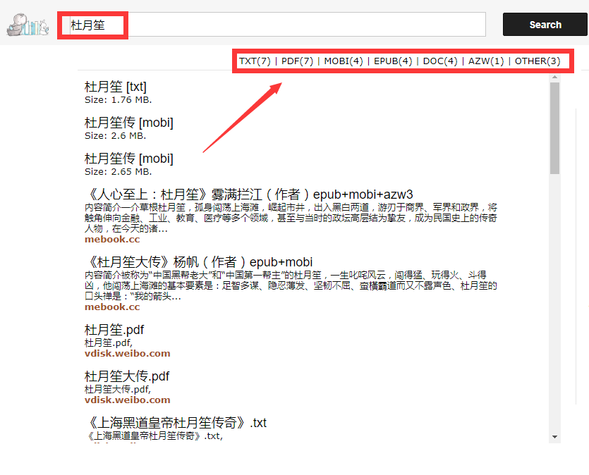從圖中可以看到 搜索 杜月笙 能找到 7本txt電子書資源,7 本pdf 電子書資源,還有4本mobi電子書資源,當(dāng)然還有其他的。