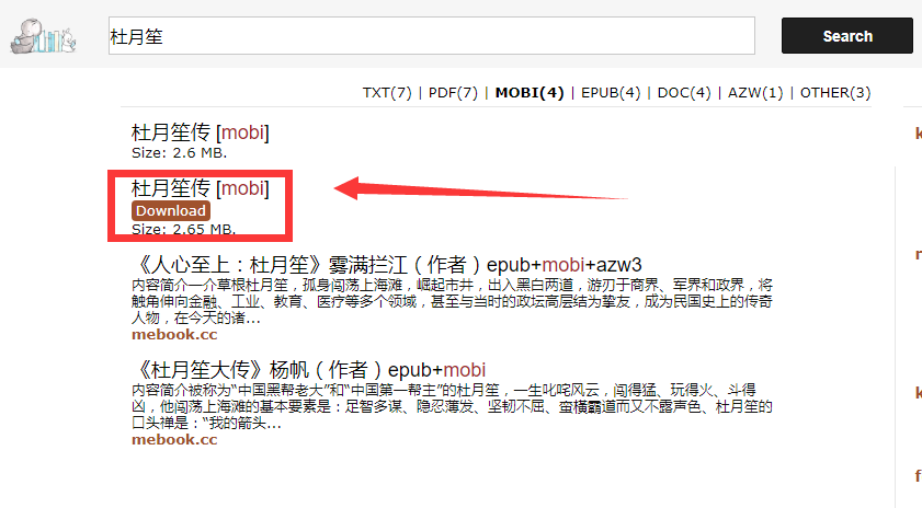 從圖中你可以看到 有4本 杜月笙的mobi資源。點(diǎn)擊第二個吧。你會看到下圖,點(diǎn)擊【Download】即完成。