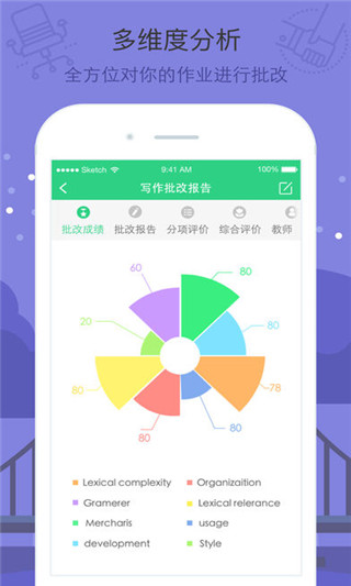 根據(jù)不同考試的評(píng)分標(biāo)準(zhǔn),有針對(duì)性的生成多個(gè)維度的批改分析報(bào)告,老師可以實(shí)時(shí)介入學(xué)生的英語(yǔ)練習(xí),加入更多的反饋信息和批改建議。
